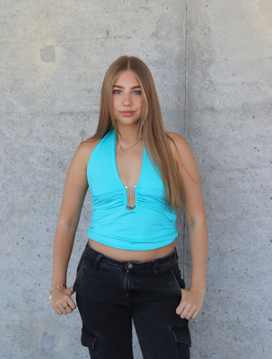 Top con fruncido a ambos lados, que estiliza la silueta y aporta un calce favorecedor. Incorpora una argolla metálica en forma de U en el centro, que le da un toque moderno y distintivo. Ideal para looks de día o noche, fácil de combinar con jeans, faldas o pantalones.