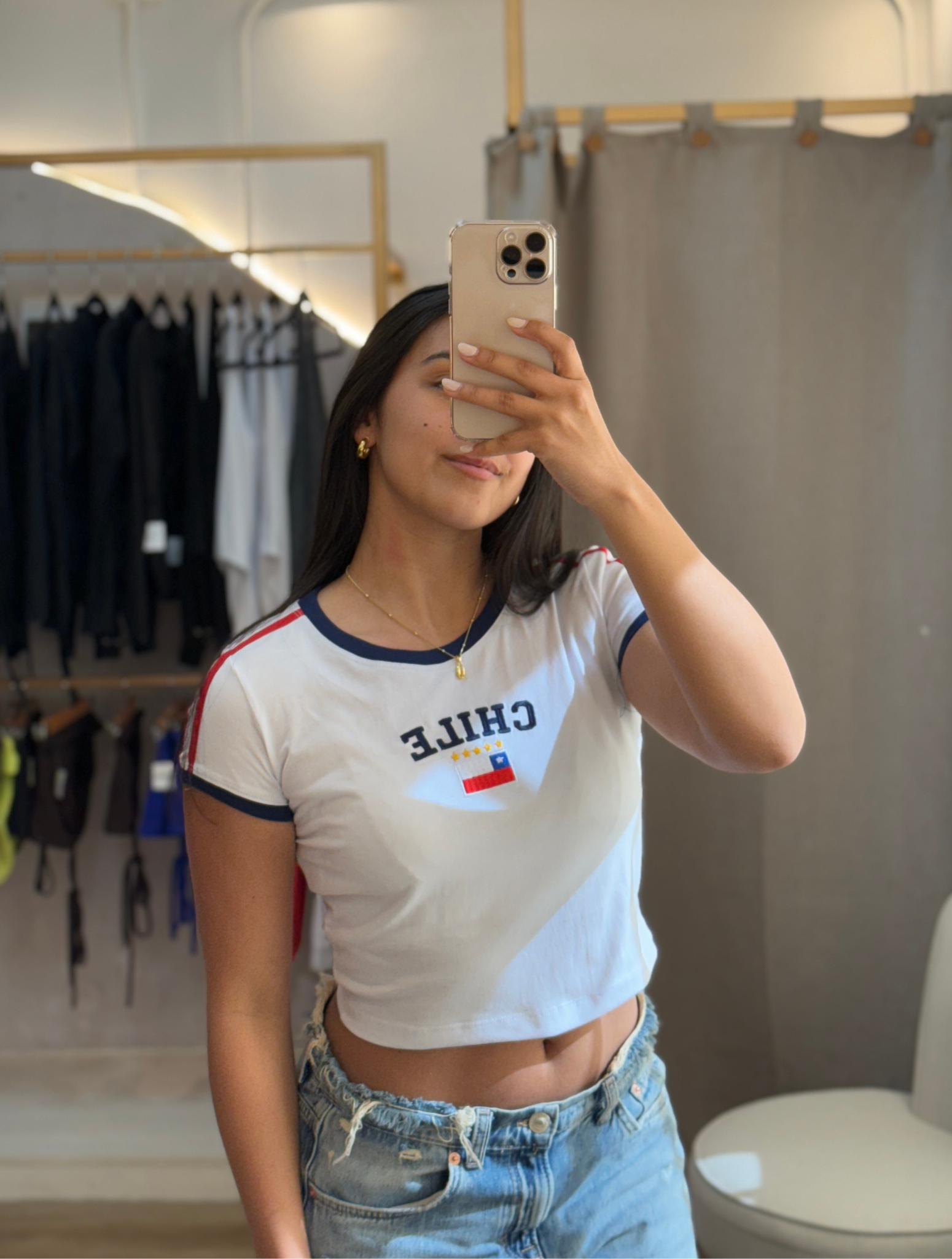 Baby Tee confeccionada en algodón y bordado “CHILE”. Este es un modelo ajustado, por lo que se recomienda pedir una talla más.